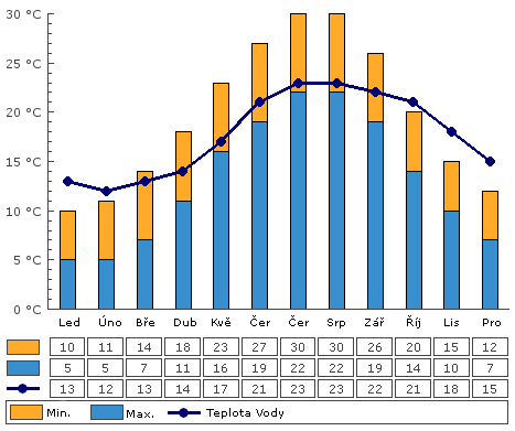 Podnebí ve státì Chorvatsko je typicky støedomoøského rázu. Mírné a krátké zimy a dlouhá a teplá léta. Nejteplejšími mìsíci na pobøeží je èervenec a srpen, kdy denní teploty mohou dosáhnout ve stínu pøes 33C a noèní neklesají pod 24C. Teploty na podzim bývají vyšší než na jaøe, totéž platí i o teplotì vody. Co se týèe vodních srážek, tak mezi nejsušší mìsíce patøí èervenec a srpen, nìkdy i záøí. Nejvíce dešových srážek spadne v listopadu a prosinci, na jaøe v bøeznu a dubnu. Sníh je na pobøeží výjimkou. Jadranské pobøeží je známé dlouhou dobou sluneèního svitu. V letních mìsících dosahuje až 11 hodin.